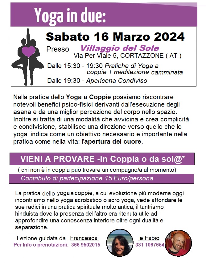 Appuntamento al Villaggio del sole il 16 Marzo per l'evento Yoga in coppia, dalle 15.30 a sera con apricena condiviso (ognuno porta qualcosa da mangiare). Iscrizioni aperte!!!