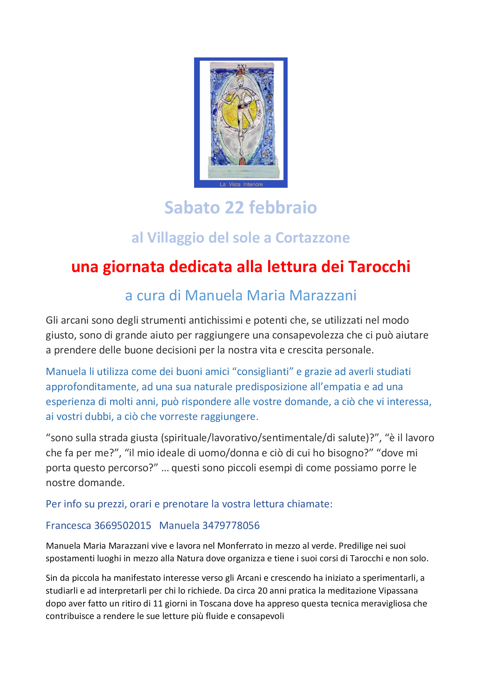 Al Villaggio del sole prevista per Sabato 22 Febbraio una Giornata di lettura dei Tarocchi a cura di Manuela Maria Marazzani. Info e iscrizioni: Francesca 3669502015 - Manuela 3479778056.